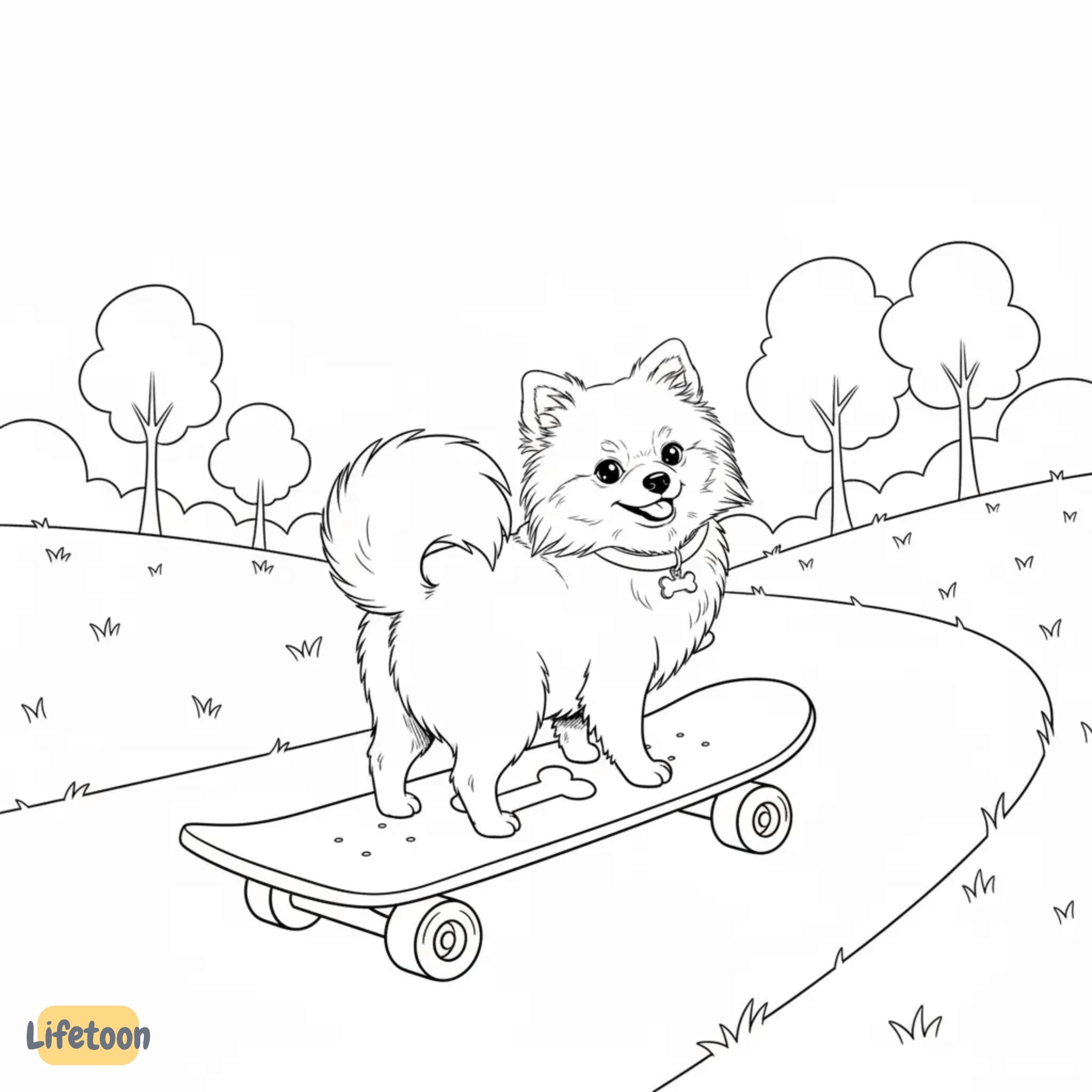 Our story is: Cookie, a puppy on a skateboard, looks back to check on Jenny, his best friend.